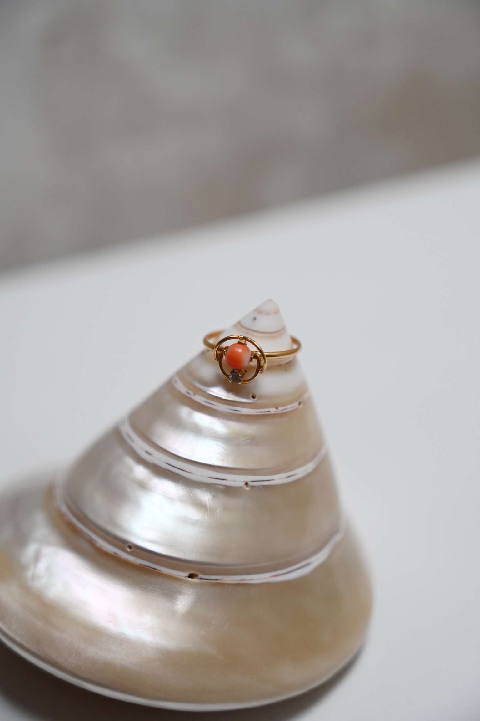 18kt antieke ring met geslepen diamant en Japans koraal.